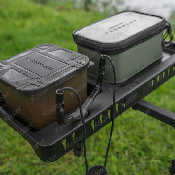 Deze Blox en Bait Tub compatibele zijlade is de perfecte metgezel aan de bank, waarbij uw benodigdheden bij de hand worden gehouden op een stabiele, verstelbare lade. Inclusief sleuf voor katapult, gaten voor reserve-installaties en een bevestigingspunt voor grijpersteunen. 48 cm x 20 cm.