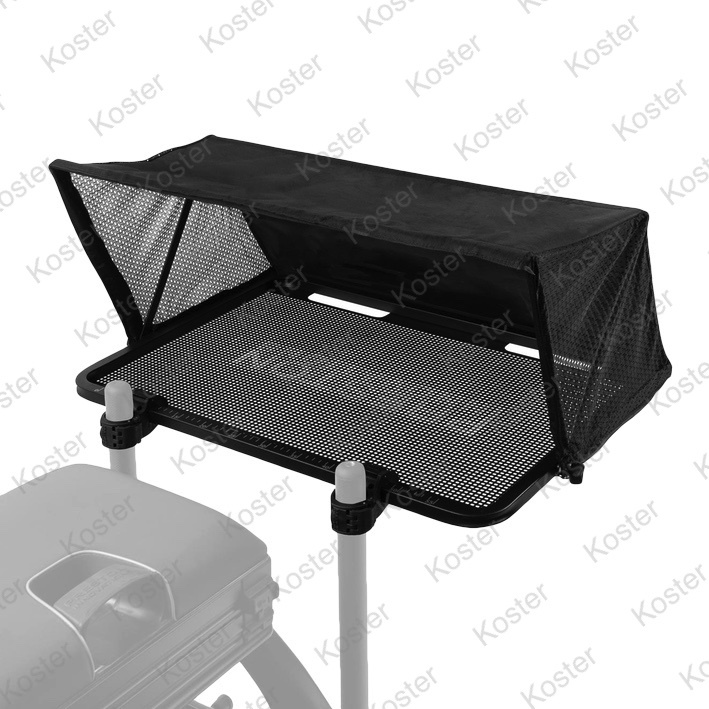 Een XL versie van de Hoodie Side Tray. Groot genoeg om een grote hoeveelheid plek te bieden veilig van de weersinvloeden zoals regen en zon. De 'Hood' is simpel uit te klappen en wordt op zijn plek gehouden met de draaiknoppen aan weerszijde. Aan de voorkant van de Side Tray is een meetlint geïntegreerd om bijvoorbeeld snel onderlijnen te meten, de diepte te checken waarop gevist wordt welke essentieel zijn voor vele vormen van visserij. Nieuwe extra sterke verbindingen maken het mogelijk deze Tray zonder extra ondersteuningspoot te gebruiken, alleen wanneer er extreme hoeveelheden aas worden gebruikt wordt aangeraden een Side Tray Support arm te monteren.